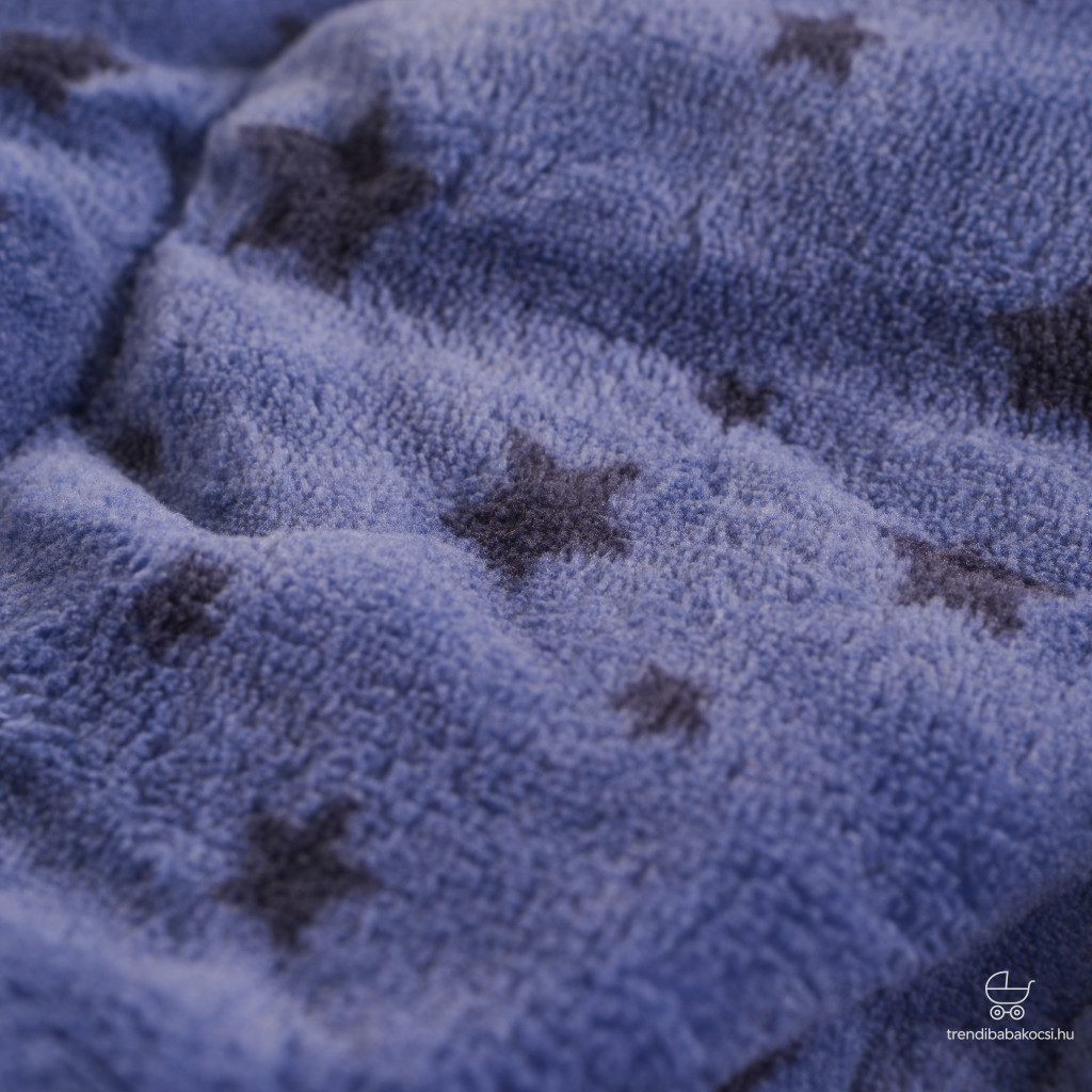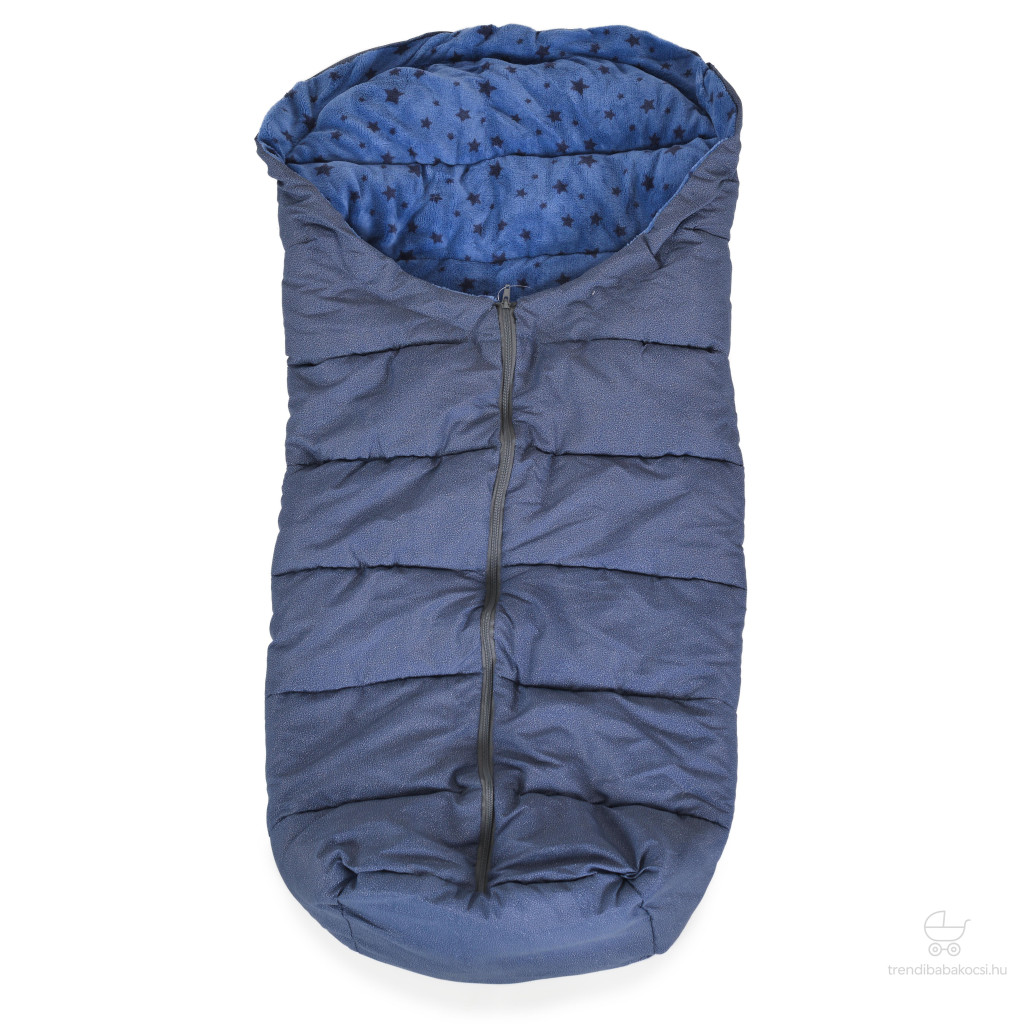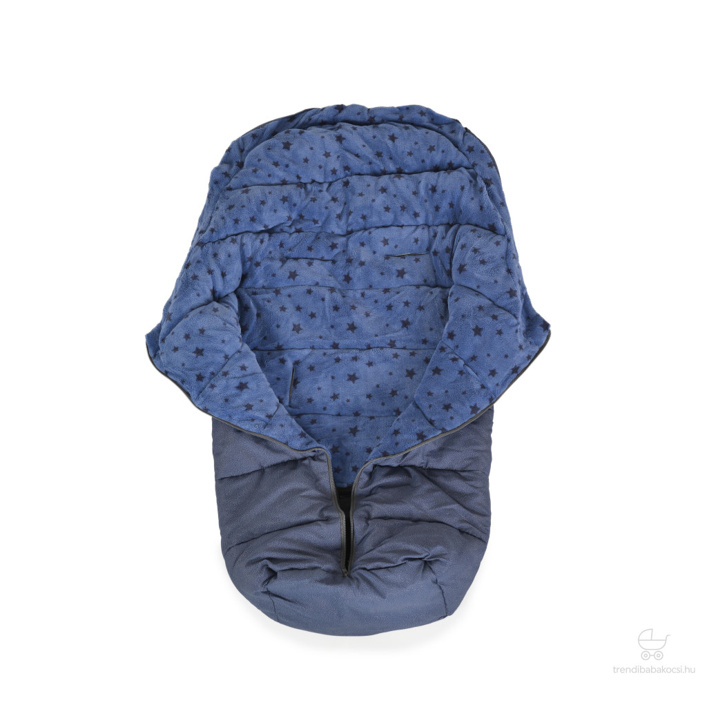 Vastag téli babakocsi bundazsák kék színben, vízálló külsővel, meleg béléssel és állítható cipzárral. Kompatibilis az 5 pontos övekkel, ideális hideg, esős vagy havas időben.