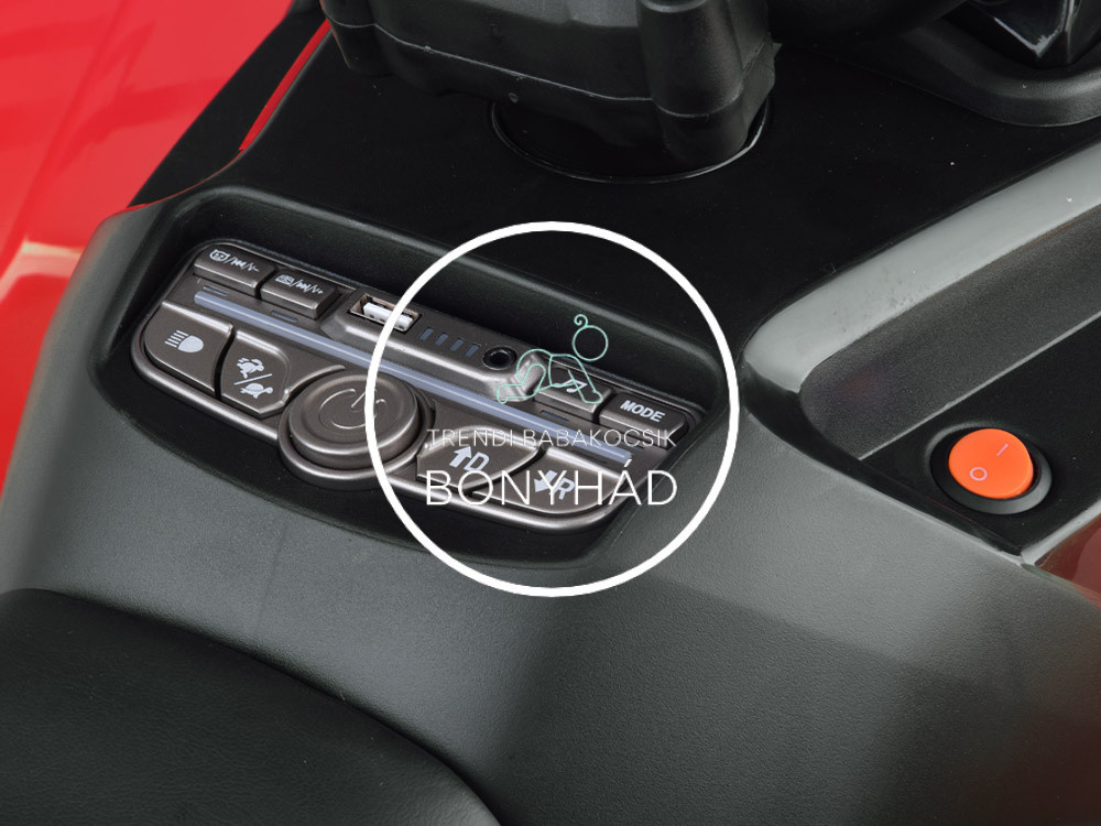 Közvetlenül mellette található egy kapcsoló a haladási irány megváltoztatásához (előre-megállás-hátra). A quadon található egy piros RC manuális kapcsoló, amely lehetővé teszi a jármű egyszerű irányítását - manuálisan is kormányozható, valamint távirányítóval is irányítható. Ez ideális megoldás azoknak a szülőknek, akik szeretnék irányítani gyermekük járművét, és ugyanakkor lehetőséget adni nekik az önálló játékra és a jármű kezelésének elsajátítására.