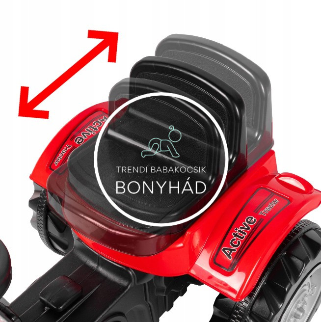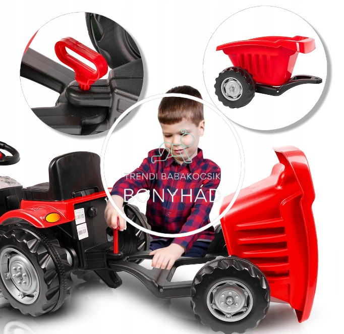 A piros színű traktor modern, élethű kialakításával igazi élményt nyújt a kicsiknek – akár a kertben, akár a ház körül játszanak vele.