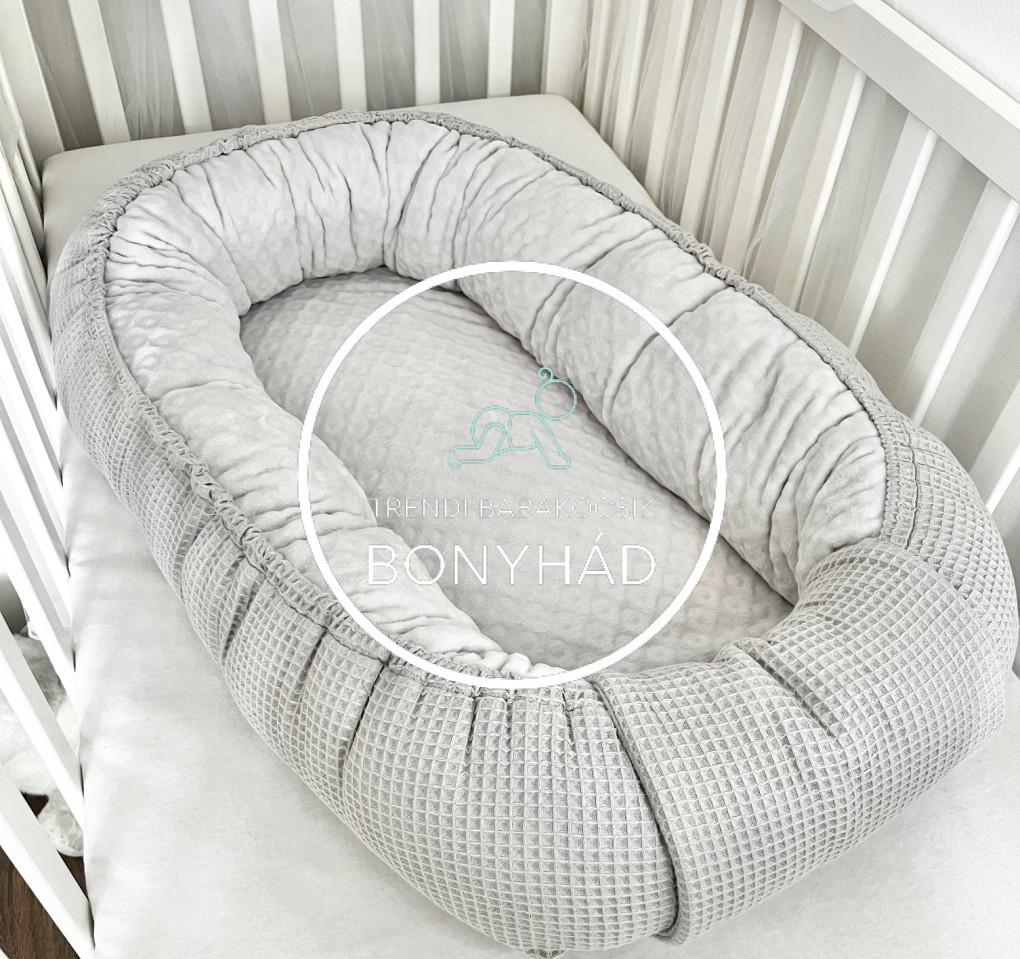A szürke waffle babafészek a letisztult elegancia és a bababiztos kényelem tökéletes kombinációja. Külső része strapabíró, mégis puha waffle pamutból készült, amely kiváló légáteresztő képességgel rendelkezik, míg belső felületét különleges, szürke alapon pöttyös karikás wellsoft anyag borítja – amely finom, meleg és megnyugtató érzetet nyújt a babának.