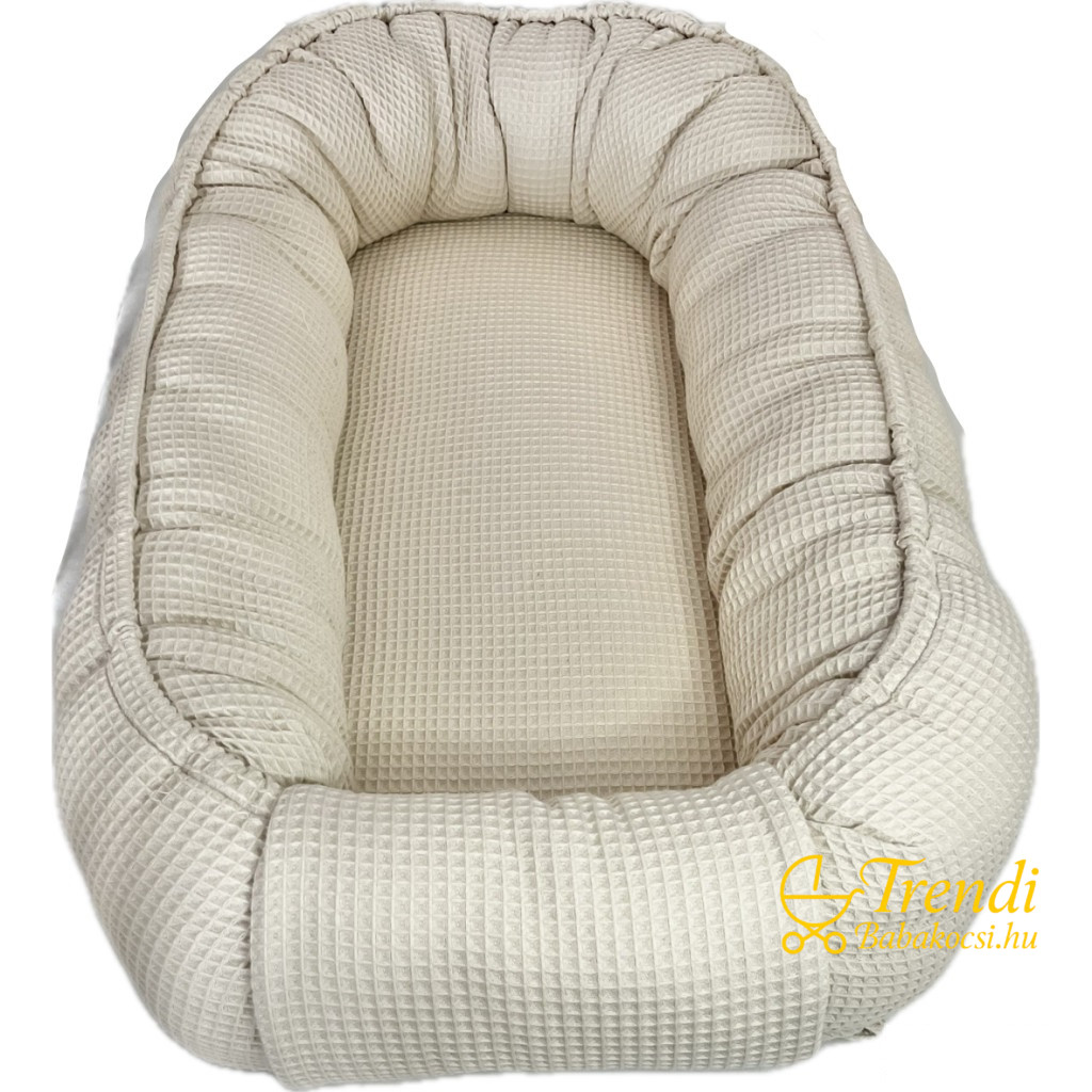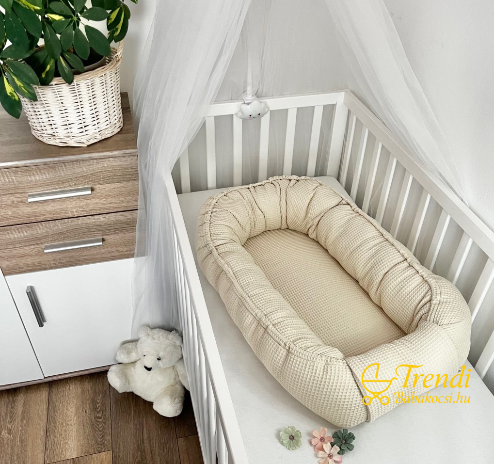 A krém színű waffle babafészek egy igazán sokoldalú és nyugalmat árasztó darab, amely minden babaszobában otthon érzi magát – és ami még fontosabb: a baba is! Ez a különleges textúrájú, 100% pamut waffle anyagból készült babafészek a méhen belüli közeghez hasonló ölelő biztonságot nyújt, amely az újszülöttek számára megnyugtató és alvássegítő hatással bír.